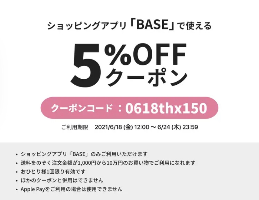 ★6月18日〜6月24日23時59分までアプリ『BASE』でのみ使える5%OFFクーポンぜひご利用下さい♪